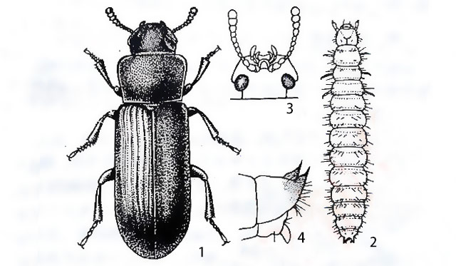 杂拟谷盗 1.成虫 2.幼虫 3.成虫头部腹面 4.幼虫臀部叉状